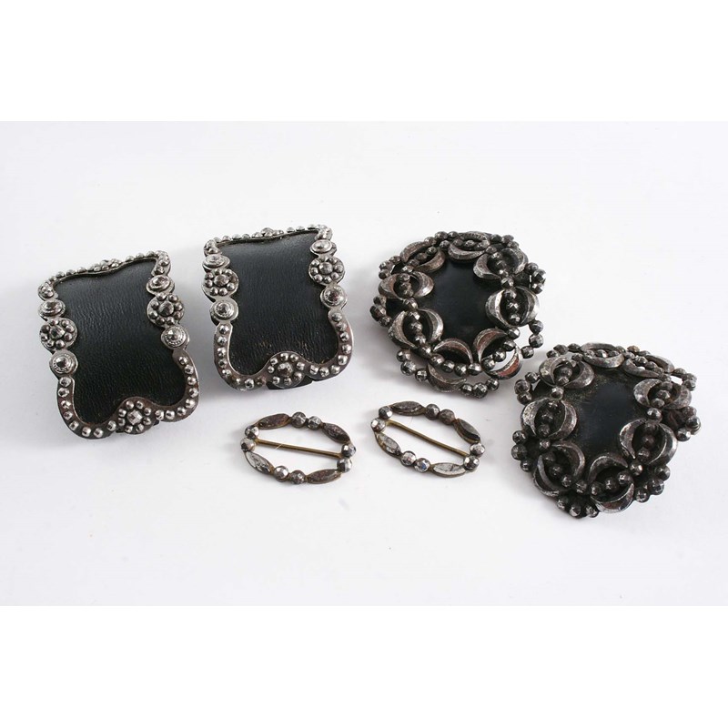 with black leather centres and blued steel, clip-on backs, 1820-30, another pair of cut-steel buckles with black leather centres, and a small pair of cut-steel & brass knee buckles; the latter 1" (2.5 cms) long (6)
