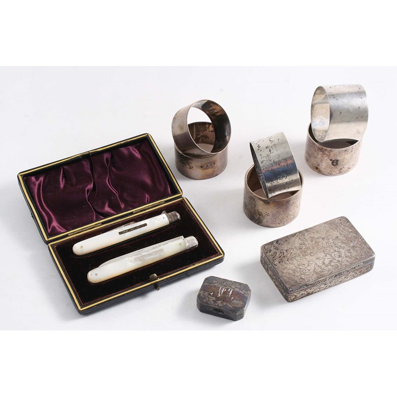 A late Victorian folding fruit knife & matching fork, with mother of pearl sides, initialled "MNJ", by Hilliard & Thomason, Birmingham 1892 (fitted case), six various napkin rings (one initialled, the rest numbered), a Victorian engraved snuff box, gilt interior, initialled, by Neustadt & Barnett, Birmingham 1840 and a pill box, initialled; the snuff box 2.9" (7.4 cms) long; 10.3 oz weighable silver (9)