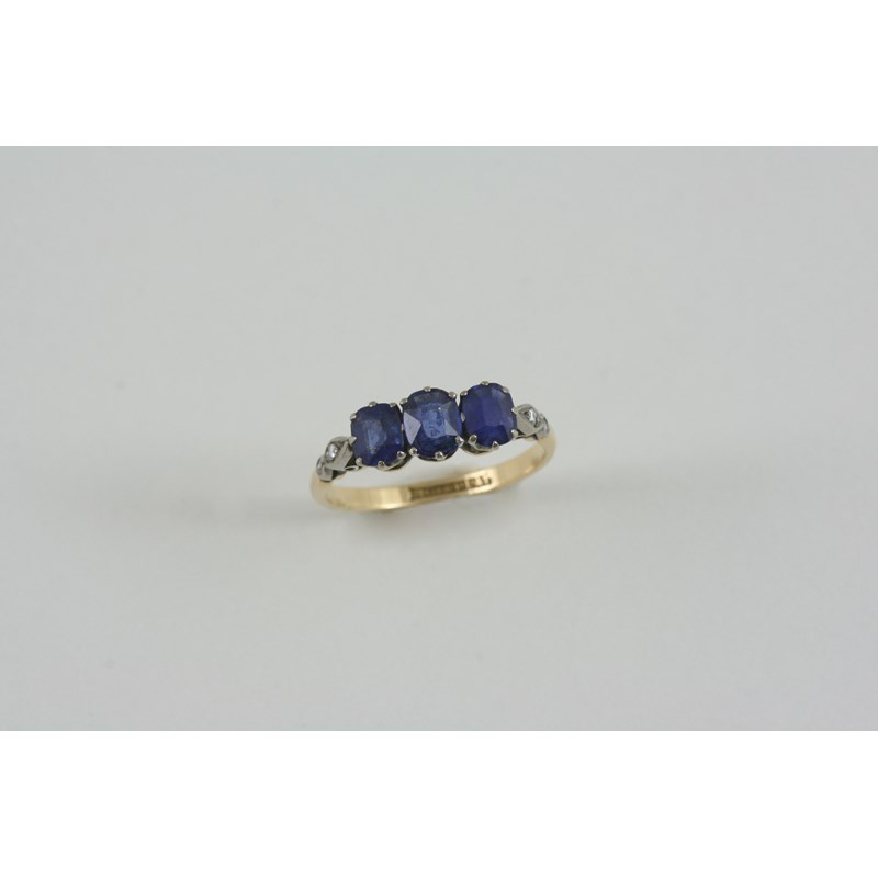 A SAPPHIRE AND DIAMOND RING the three oval-shaped sapphires are set with two rose-cut diamonds to each shoulder, in 18ct. gold and platinum. Size O.