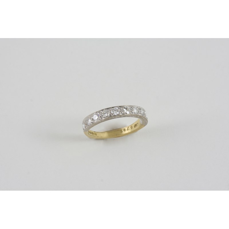 A DIAMOND HALF HOOP RING millegrain set with circular-cut diamonds in 18ct. gold. Size M.
