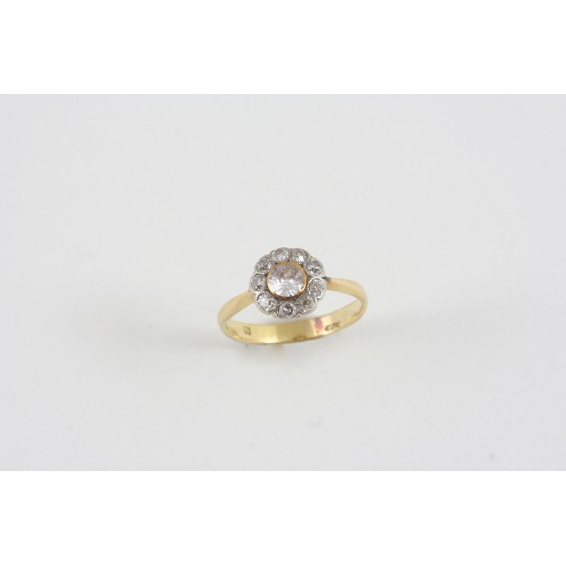 A DIAMOND CLUSTER RING the central old brilliant-cut diamond is set within a surround of circular old-cut diamonds, in gold. Size K 1/2.