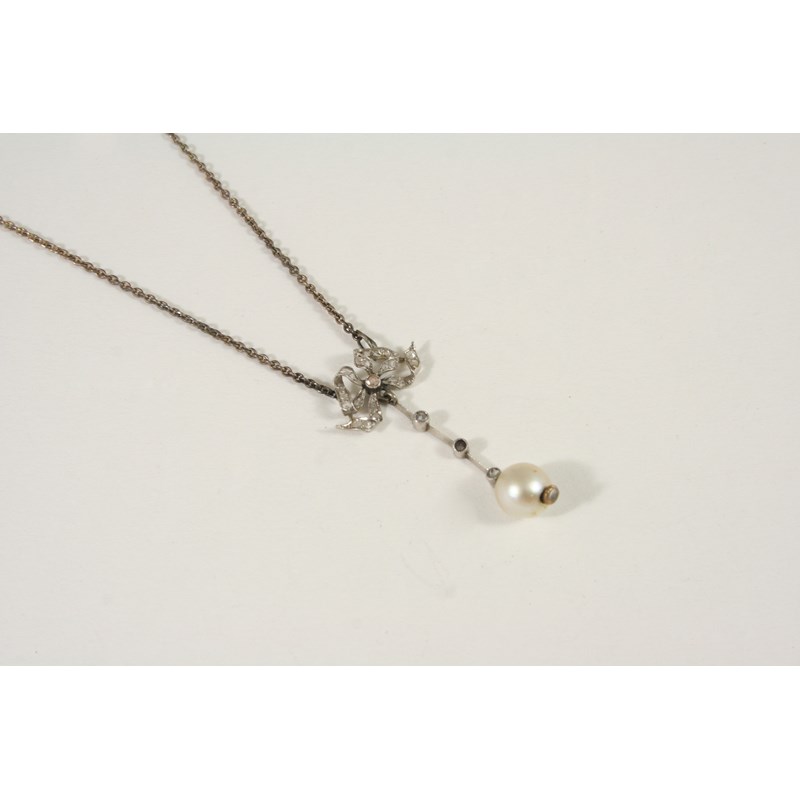 AN EDWARDIAN DIAMOND AND PEARL PENDANT the bow surmount is set with rose-cut diamonds and suspends an untested pearl drop, 4cm. long.