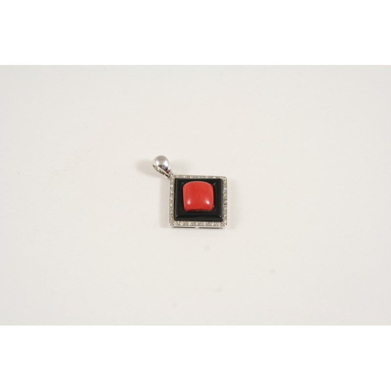 AN ART DECO CORAL, BLACK ONYX AND DIAMOND PENDANT