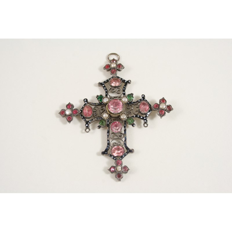 A CONTINENTAL ENAMEL AND PASTE SET CRUCIFORM PENDANT the silver openwork mount with black and white enamel decoration and set with pink and green paste stones and small pearls, 6.5 x 5.5cm.