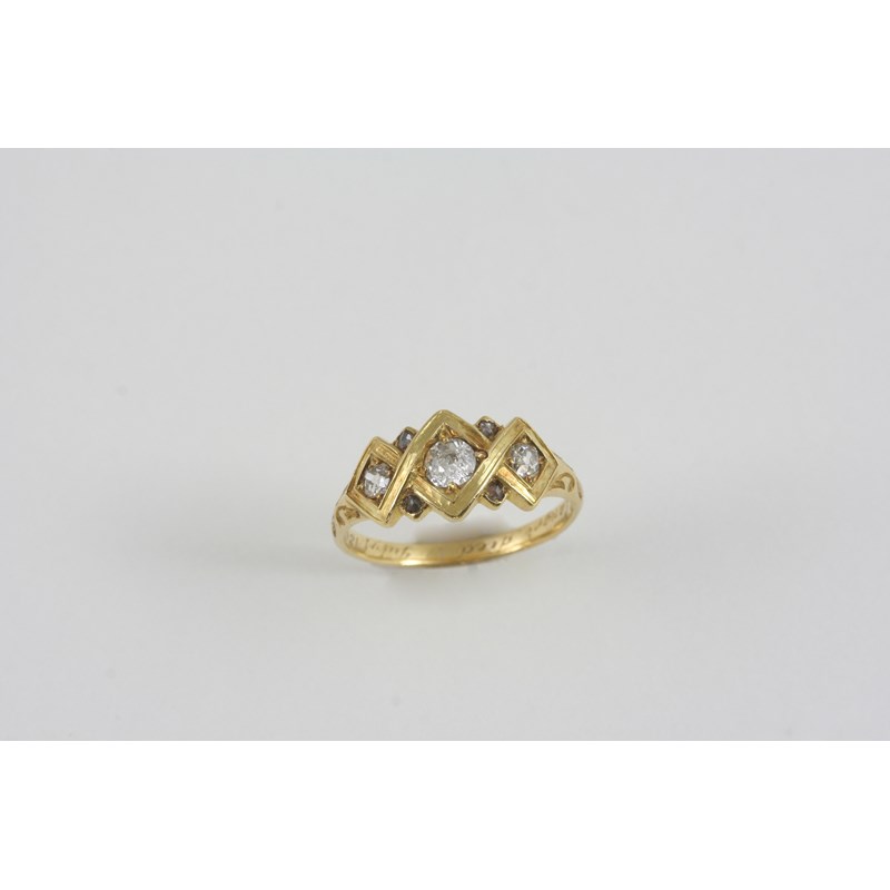 the three graduated old brilliant-cut diamonds are set with rose-cut diamonds in 18ct. gold, inscribed to the inner shank R.C.S Ranger died July 1 1867 aged 56. Size O 1/2.