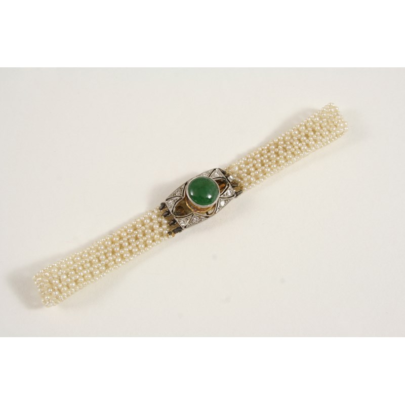 AN EARLY 20TH CENTURY JADE, DIAMOND AND SEED PEARL BRACELET