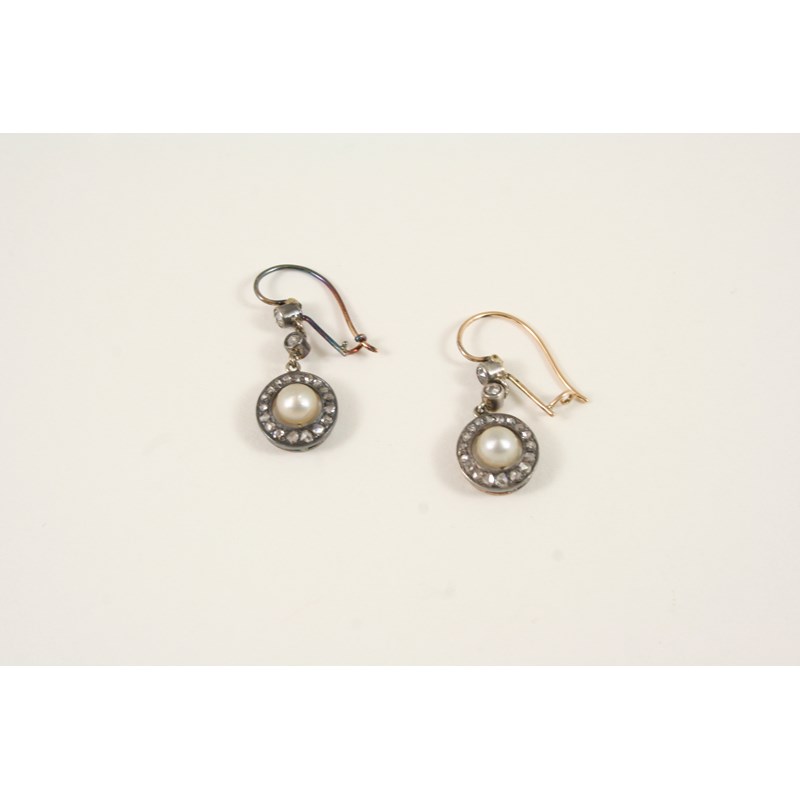 A PAIR OF DIAMOND AND PEARL CLUSTER DROP EARRINGS