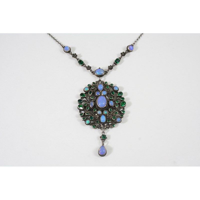 the silver openwork foliate pendant is mounted with closed-back oval, circular and pear-shaped opals and graduated pear-shaped green paste stones, stamped 'G' to the reverse and also to the reverse of the pendant opal surmount, the pendant 4cm. wide.
