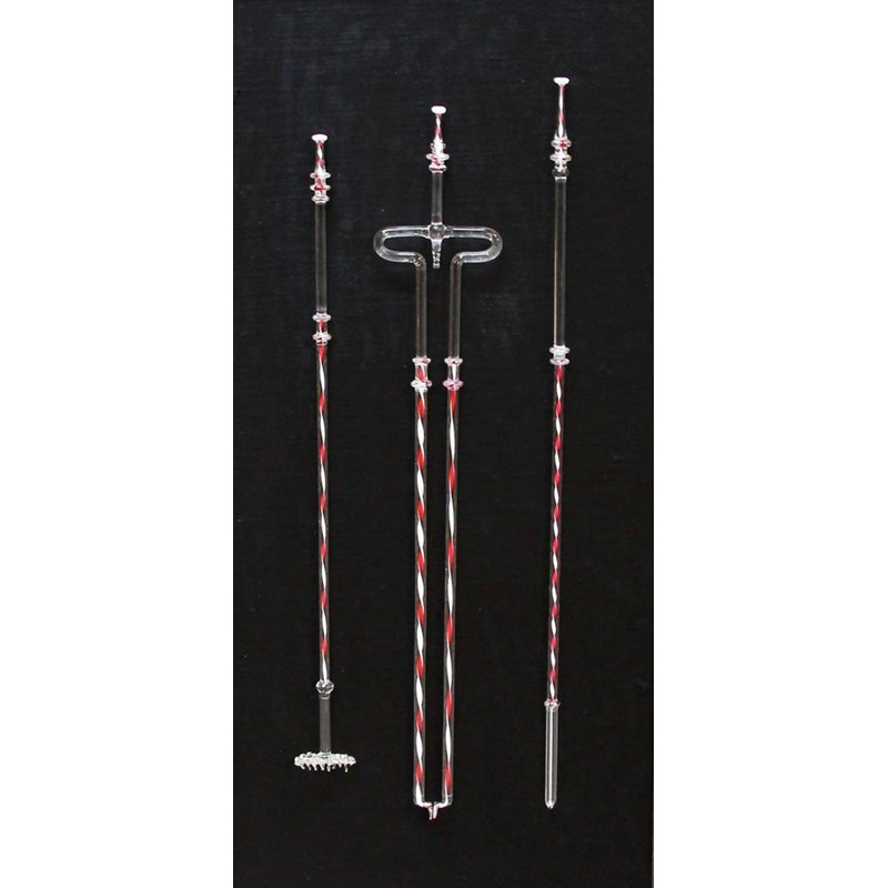 FRAMED SET OF THREE GLASS FRIGGER FIRE IRONS, with red and white barley twist decoration to the finials and shafts, length of poker 57cm