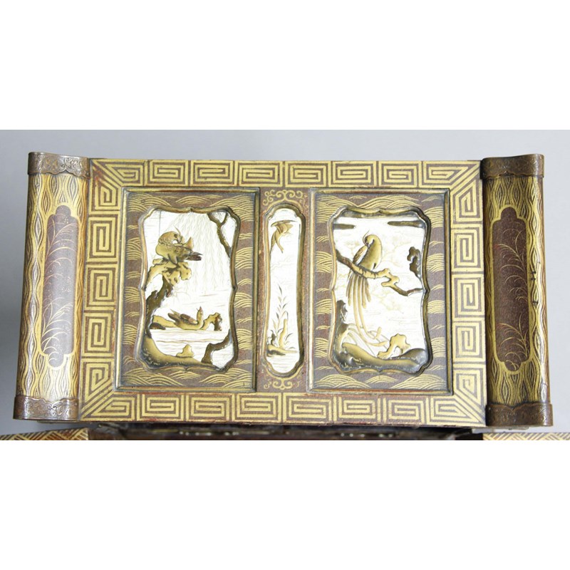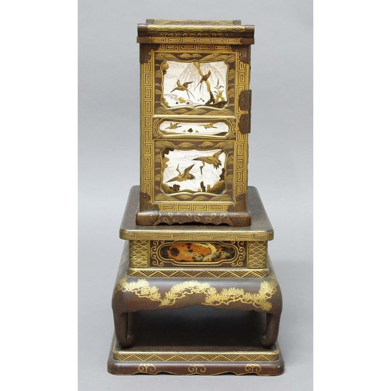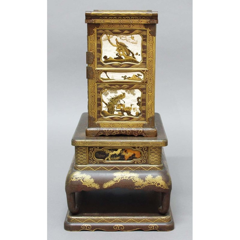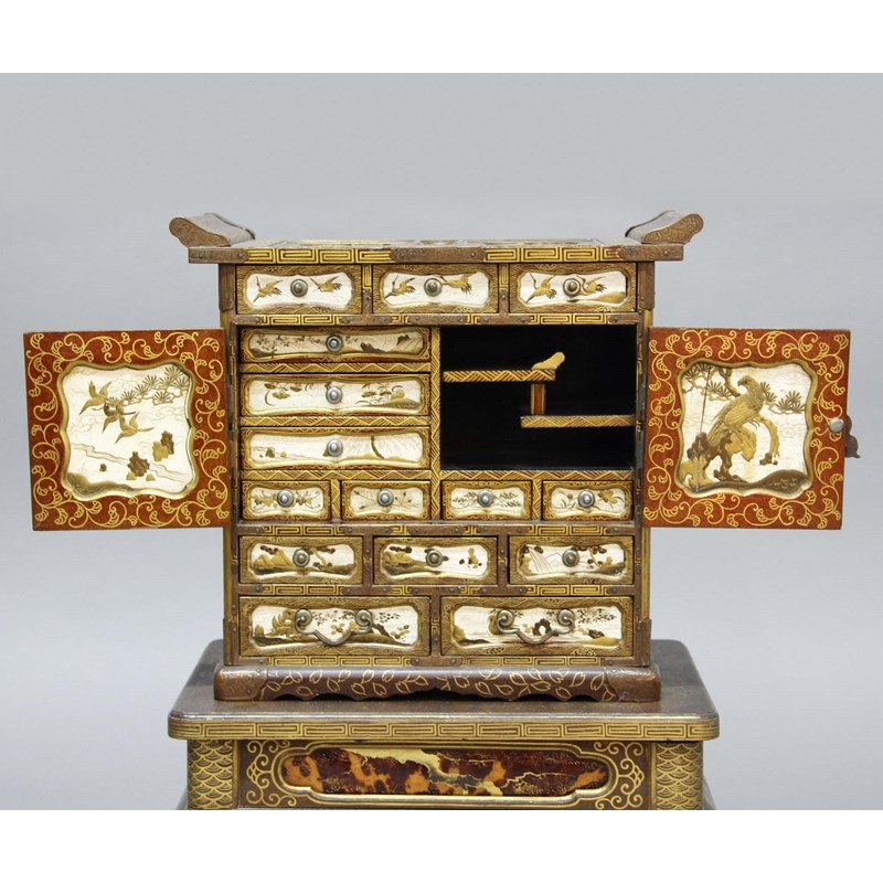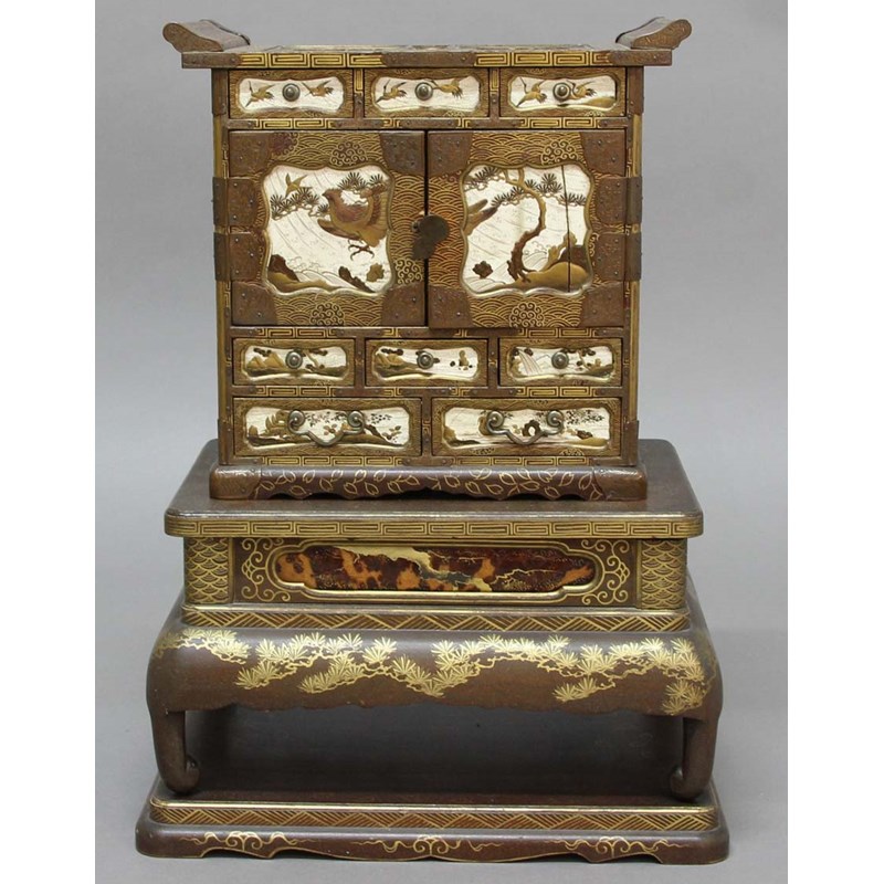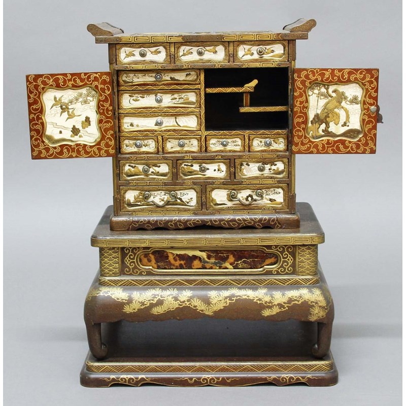 the cabinet with three small drawers above a pair of doors enclosing an arrangement of drawers and shelves above three further small drawers and two larger drawers, the whole inside with ivory and lacquered panels of birds and landscapes, the base inset with tortoiseshell panels gilded and lacquered with foliage and on short, scrolled feet, further gilded with pine foliage and scales, the rectangular base with gently scrolling edges with stylised foliate and geometric decoration, height 54cm, maximum width 39cm, maximum depth 27cm (3)