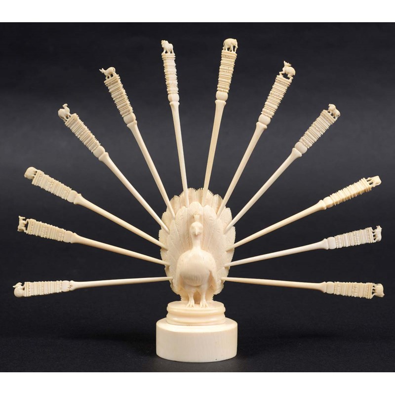 INDIAN IVORY TOOTH PICK HOLDER, 19th century, carved as a peacock with its tail fanned, with twelve picks each with an animal finial, maximum height 19cm