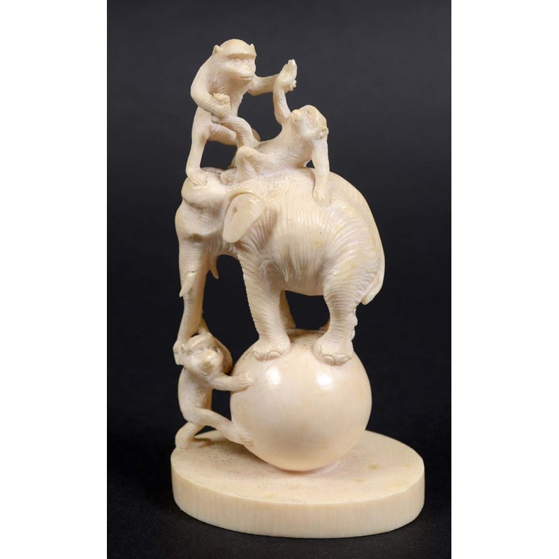 JAPANESE IVORY OKIMONO, Meiji, carved as an elephant and three monkeys balancing on a ball, height 12cm