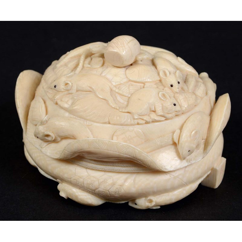 JAPANESE IVORY BOX AND COVER, Meiji, carved as rats climbing over a basket, carved signature plaque, length 10cm