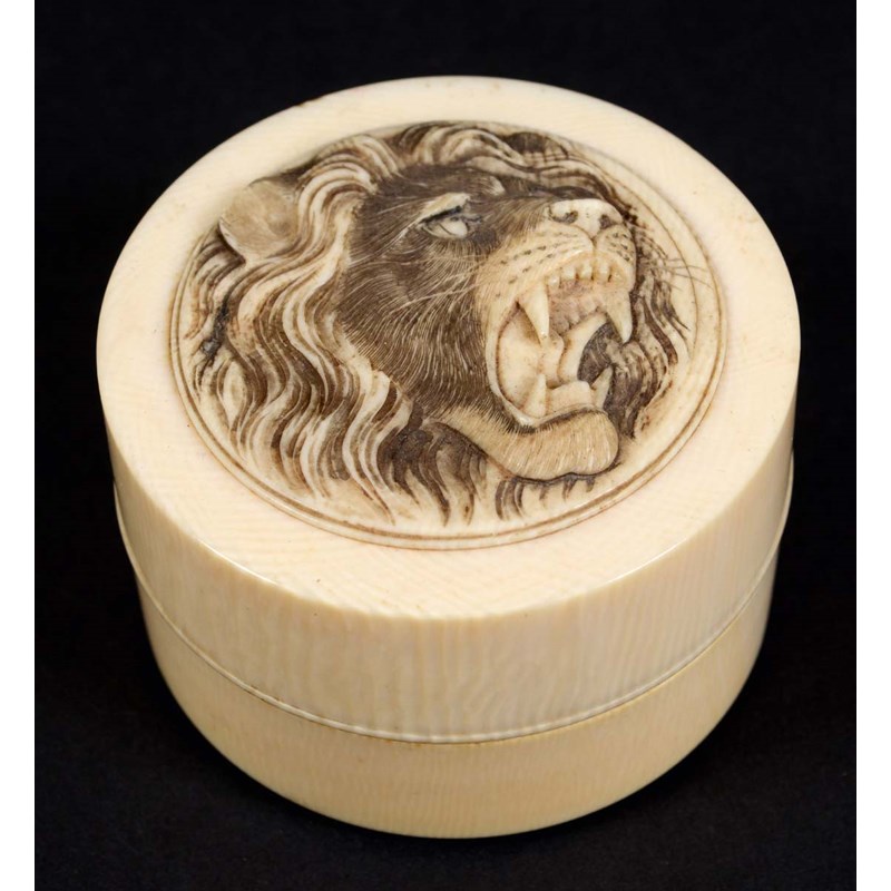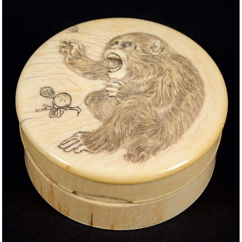 TWO JAPANESE IVORY CIRCULAR BOX AND COVERS, Meiji, one carved with a roaring lions head the other with a shouting monkey, both with carved bug signatures, diameters 6.5cm and 7.5cm (2)