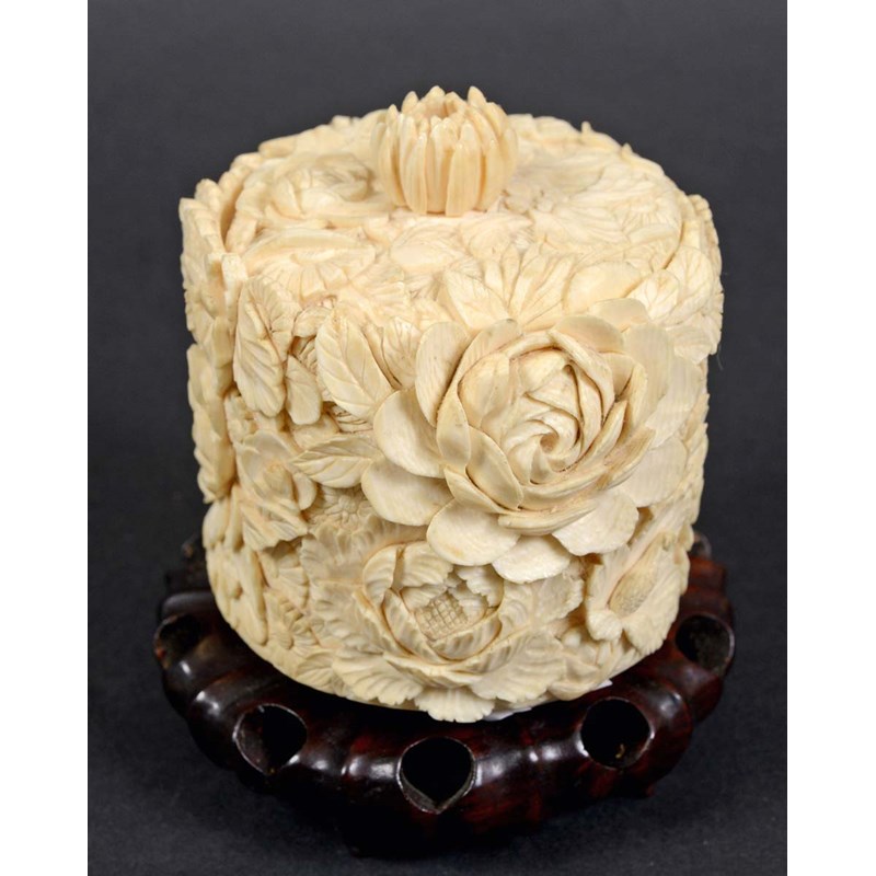 Meiji, all cover carved with lotus and other flowers, the cover with lotus flower finial, carved bug signature, with a hardwood stand, height excluding stand 9cm, diameter 9cm