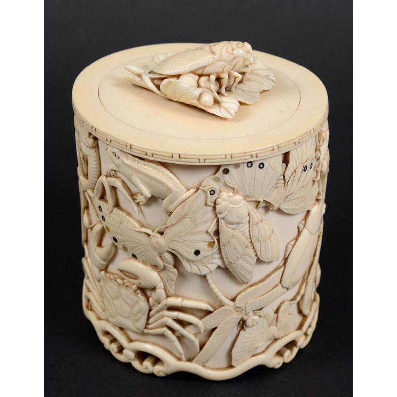 mid to late 19th century, well carved with bats, frogs, snails, butterflies, moths and other insects, the cover with a bee finial, height 14cm, maximum width 11cm