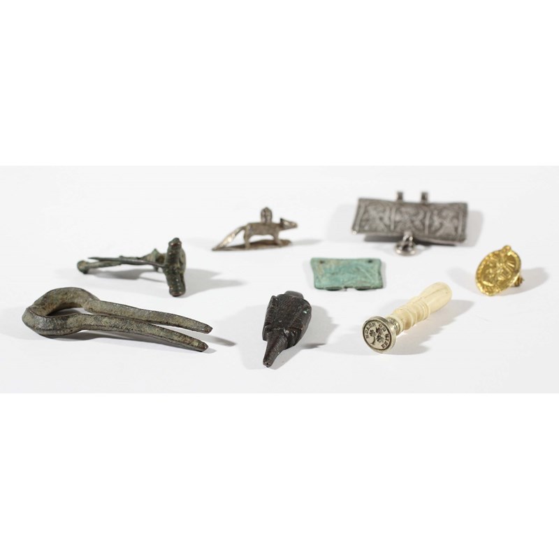 a mixed collection of antiquities and similar items, to include Anglo Saxon and Medieval belt mounts, Roman bronze items, an Irish seal inscribed Erin Go Bragh around shamrocks, Greek or Egyptian silver mongoose pendant and other items (parcel)