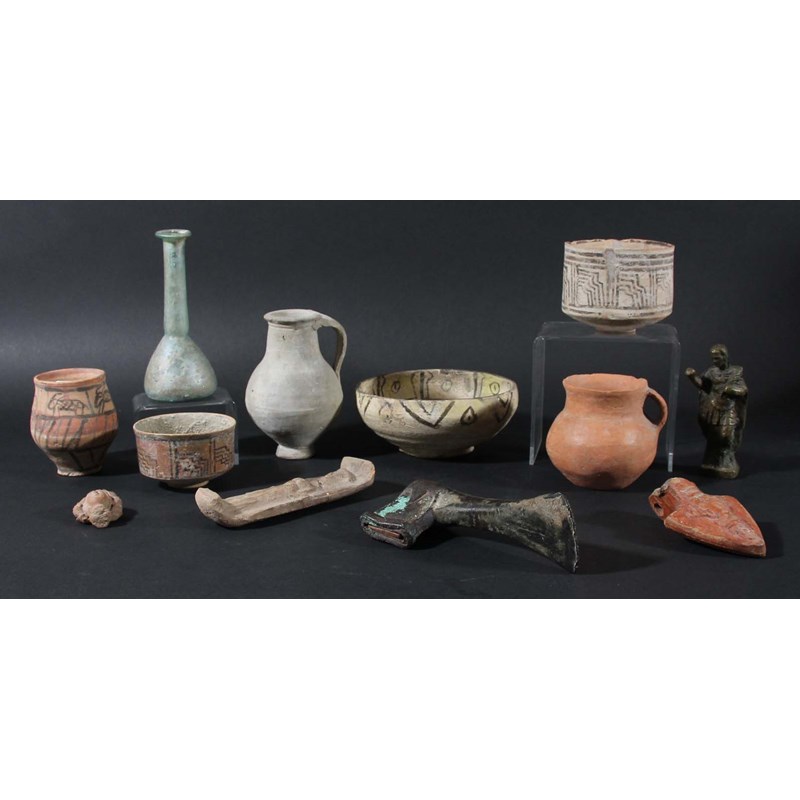 ANTIQUITIES: a mixed collection to include a Roman Glass unguentarium, Roman pottery fragments, three Indus Valley pottery bowls, bronze axe head and other similar, later items (parcel)