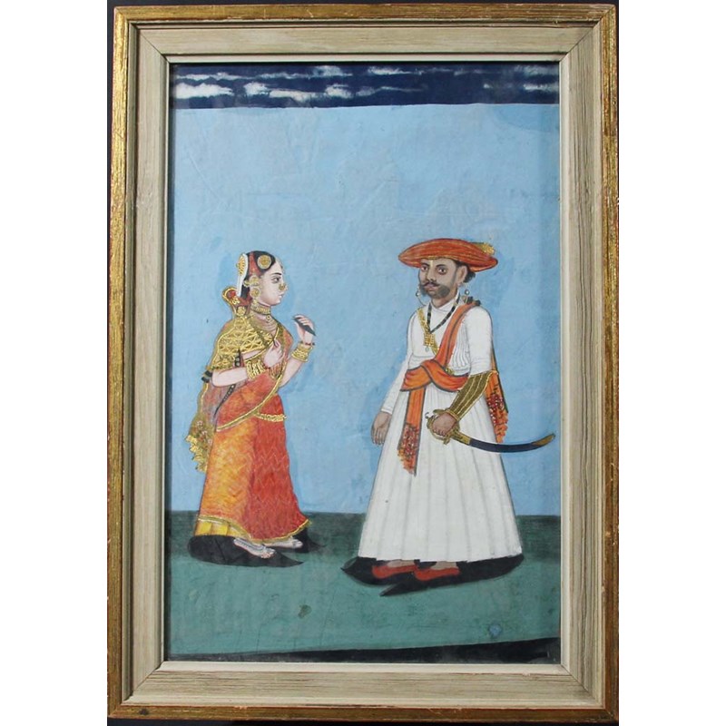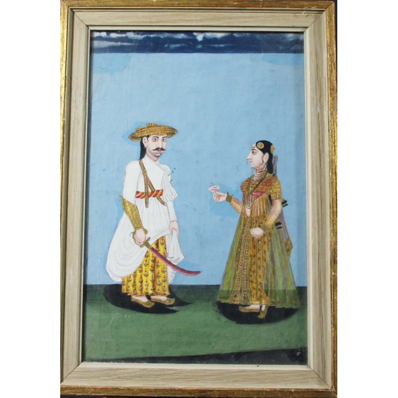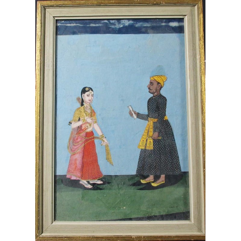 probably Punjab and 19th century, each painted with a young couple on a blue background, with gilt high lights, 29cm x 19cm (3)