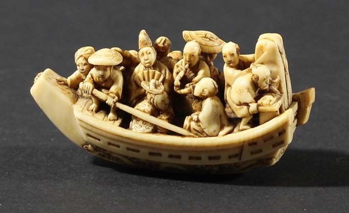 JAPANESE IVORY NETSUKE, by Ikkosai Toun, Edo period, carved as a boat full of people, waves breaking along the hull, signature to base, length 5cm