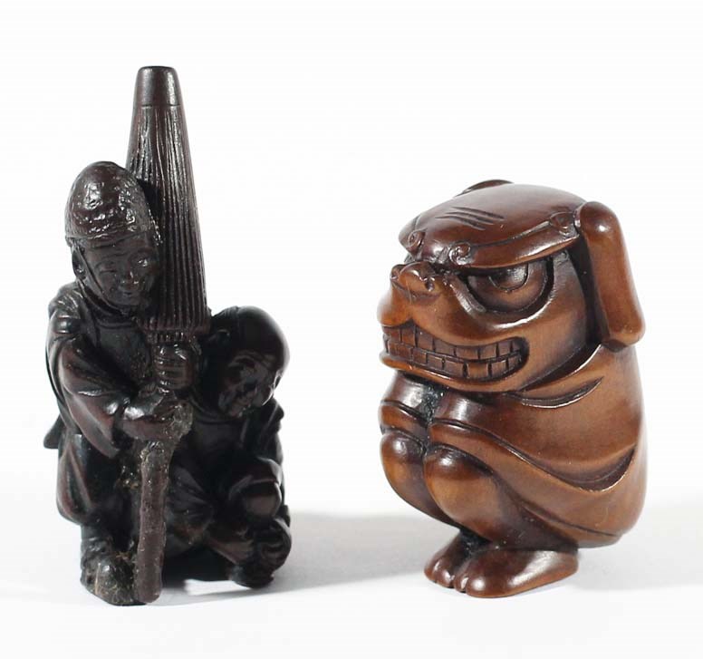 TWO JAPANESE WOODEN NETSUKE, one carved as two men, one carrying a large parasol, the other as a stylised beast, 5cm and smaller (2)