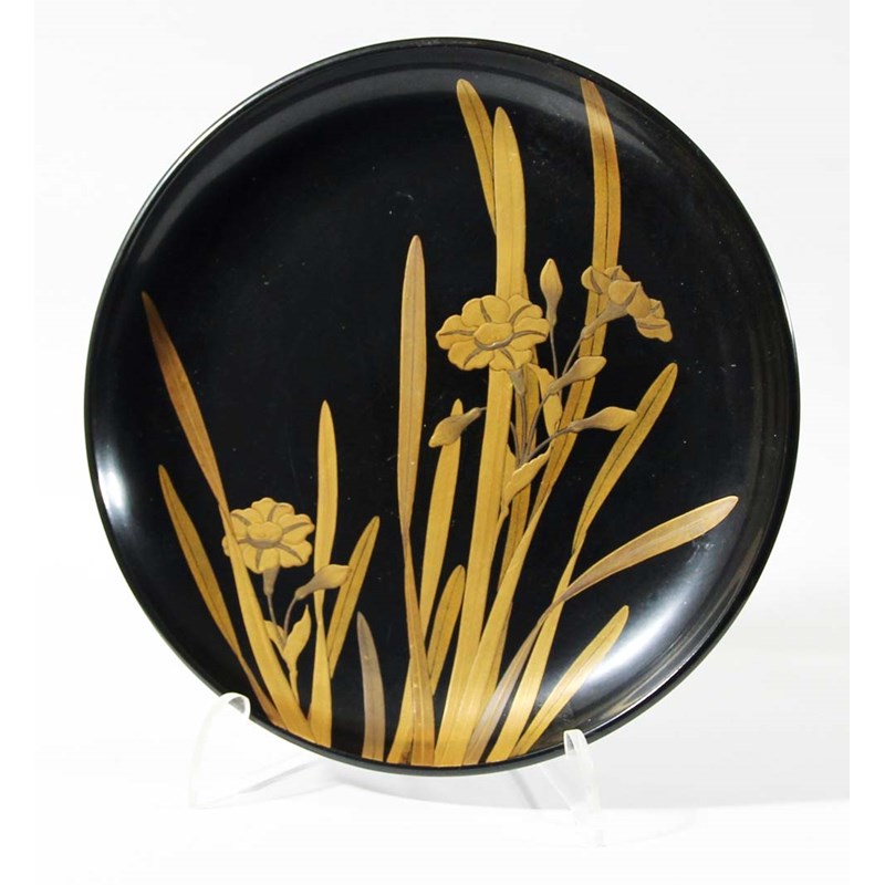 JAPANESE BLACK LACQUER SAUCER, Meiji or 20th century, with gilt floral decoration, two character seal mark verso, diameter 17.5cm