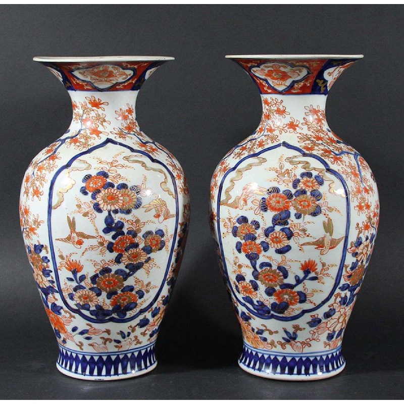 PAIR OF JAPANESE IMARI VASES, 19th century, of baluster form, decorated with ogee panels of flowers and birds beneath the flared mouth, height 30cm (2)