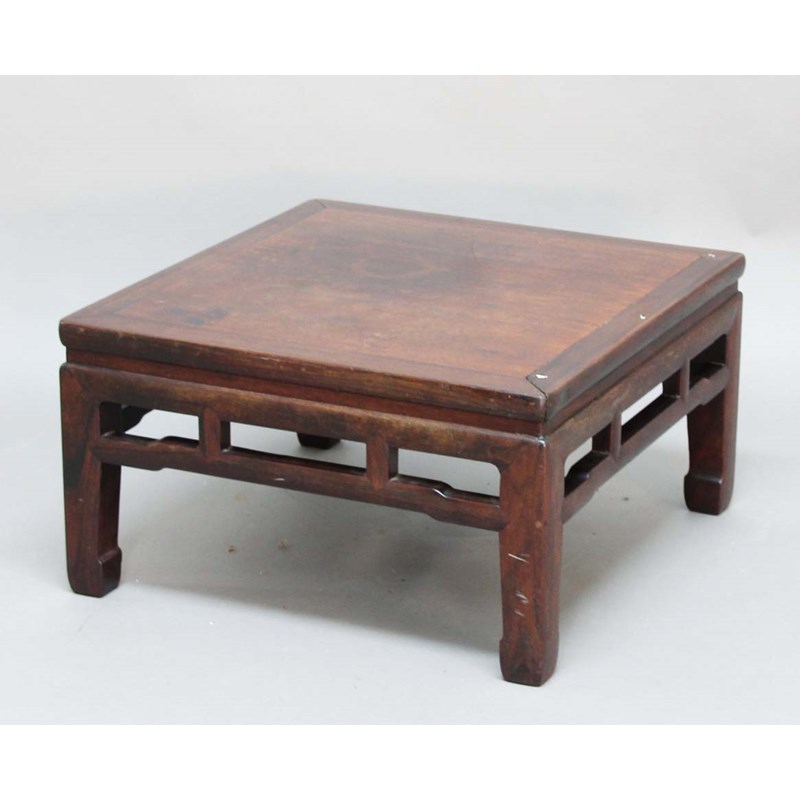 CHINESE HARDWOOD SQUARE LOW TABLE, with shaped stretcher and square section legs, height 34cm, 63cm square