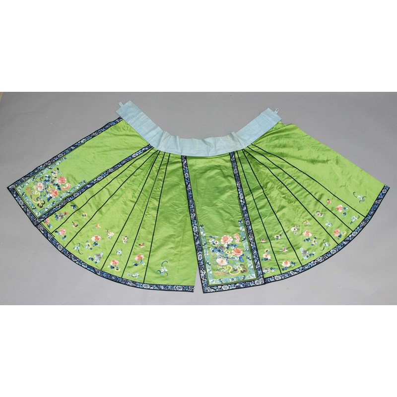 late 19th or early 20th century, the apple green ground worked with chrysanthemum and other flowers inside a scrolling, floral border, each panel with further scrolling and floral edging, salmon pink silk lining, length 95cm, waistband 130cm