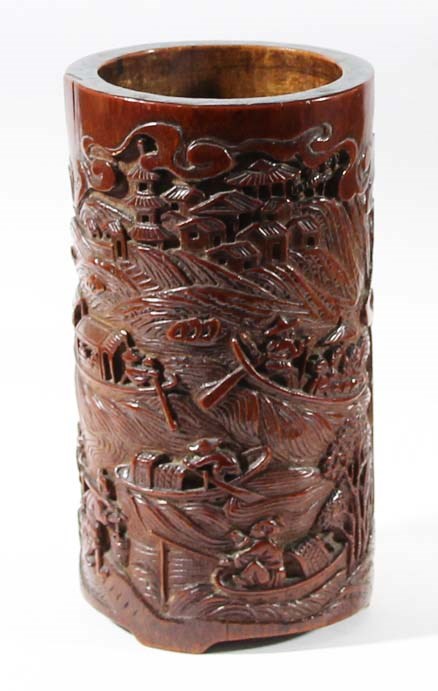 CHINESE BAMBOO BRUSH POT, BITONG, carved with a continuous lake scene, height 12.5cm