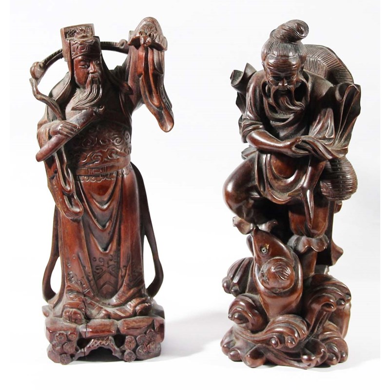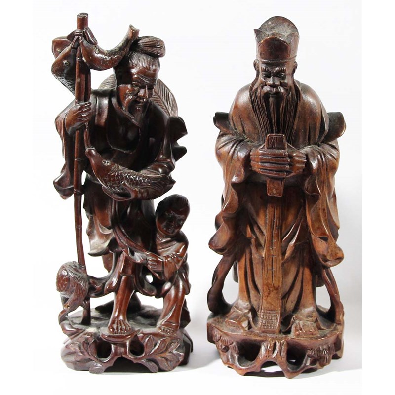 GROUP OF FOUR CHINESE WOODEN FIGURES, late 19th or early 20th century, with glass eyes and ivory teeth, each carved as an immortal with various accessories including a bat, fish and boys, height 20cm approx (4)