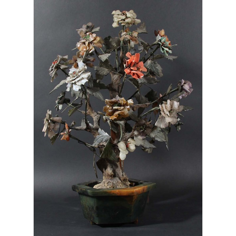 CHINESE HARDSTONE AND JADE TREE, with numerous branches of leaves and flowers from a main trunk, in a hexagonal jade type bowl, height 57cm