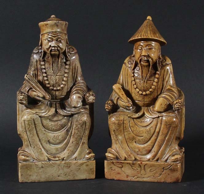 PAIR OF CHIINESE STONE CARVINGS, early 20th century, the two immortals or wise men seated on tiger skin rugs on chairs, six character marks carved to underside of bases, height 20cm (2)