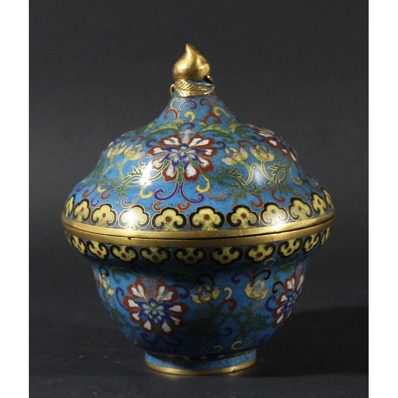 probably Qianlong, of ogee form with scrolling floral decoration and ruyi borders and gilt peach finial, height 17cm (2)