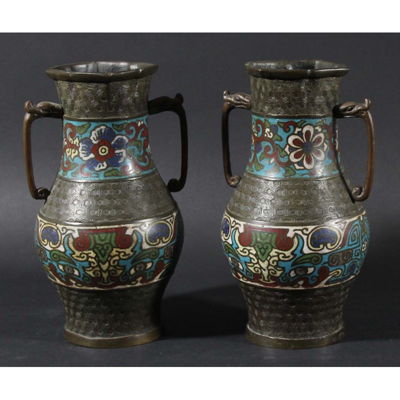 PAIR OF CHINESE BRONZE AND CHAMPLEVE VASES,