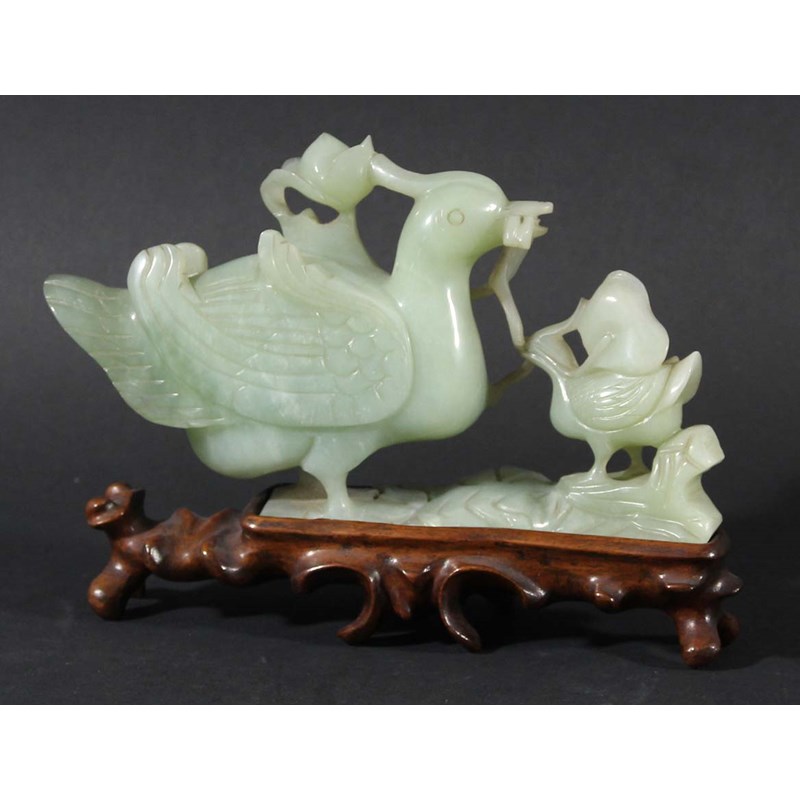 CHINESE CELADON JADE GROUP, carved as a duck and ducking, on a hardwood stand, length 19cm