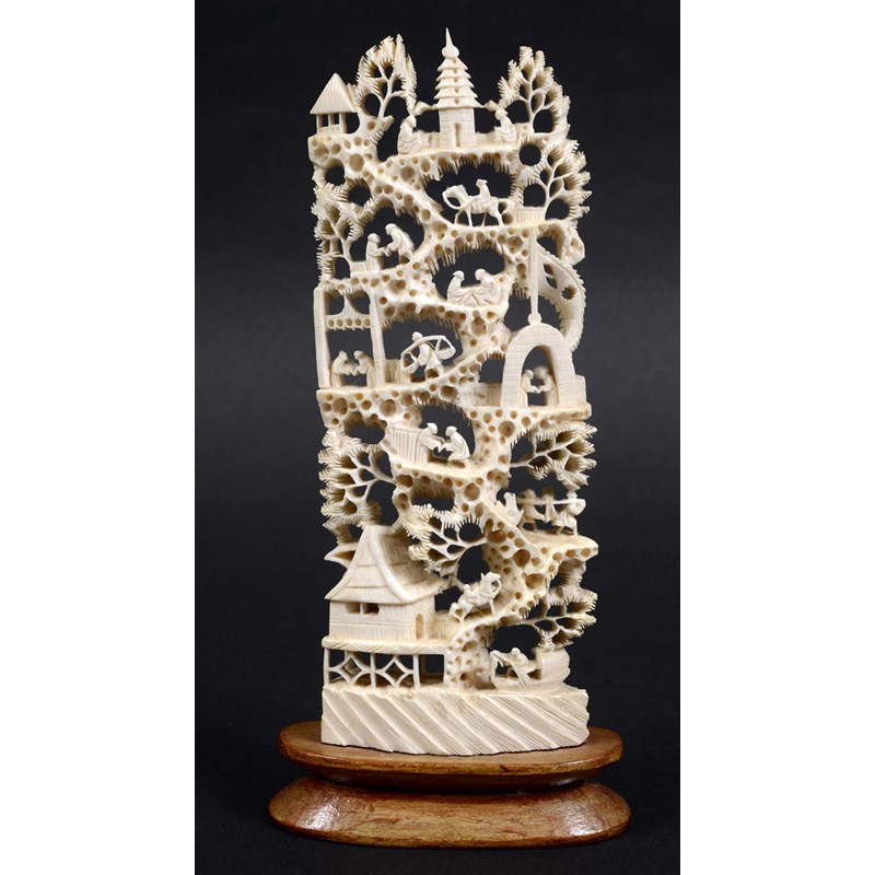 CHINESE IVORY CANTON STYLE CARVING, circa 1900, the hillside scene of figures climbing up from a house on stilts through trees to a pagoda, height excluding stand 19cm