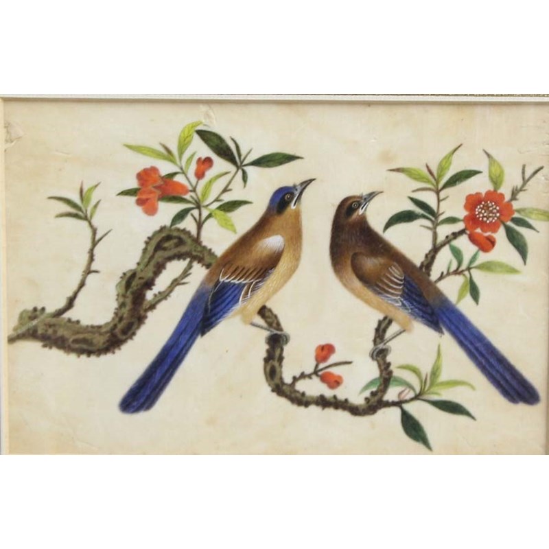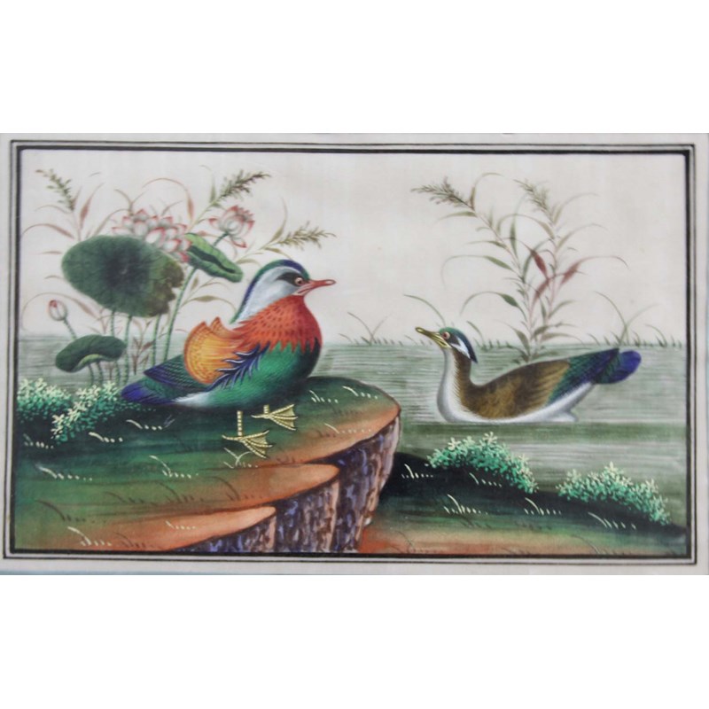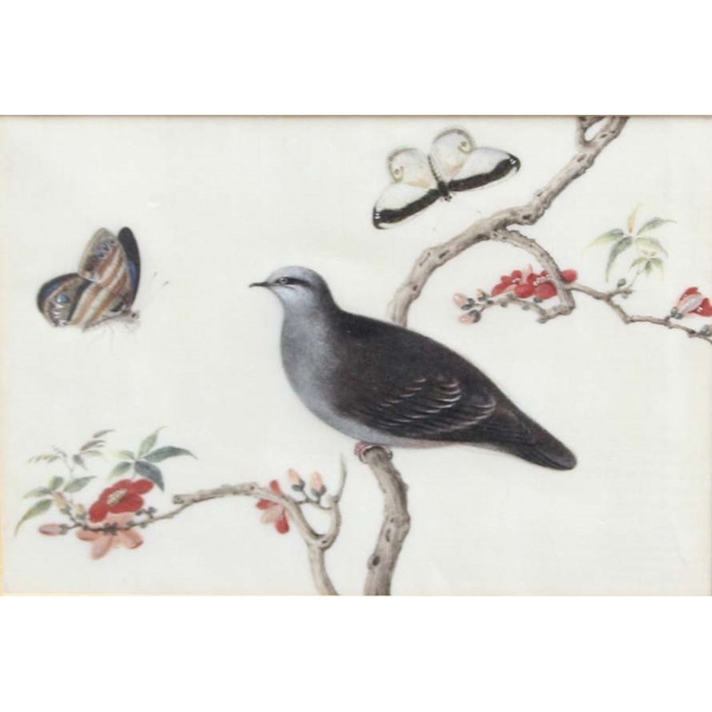 of mandarin ducks on a lake, 20cm x 32cm; together with another of a dove and butterflies, 14cm x 20cm; and a third of a pair of birds in flowering prunus, 11.5cm x 17cm (3)