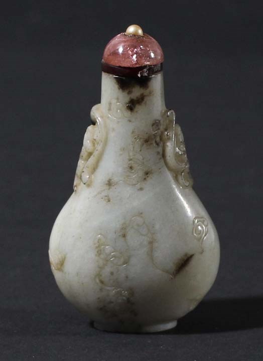 CHINESE NEPHRITE JADE SNUFF BOTTLE, light grey with black mottling, of bottle form carved with scrolling ruyi, height 6.5cm;