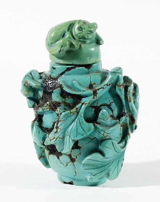 CHINESE MATRIX TURQUOISE SNUFF BOTTLE, carved with two rats climbing through foliage, the stopper carved as a cat, height 5.5cm