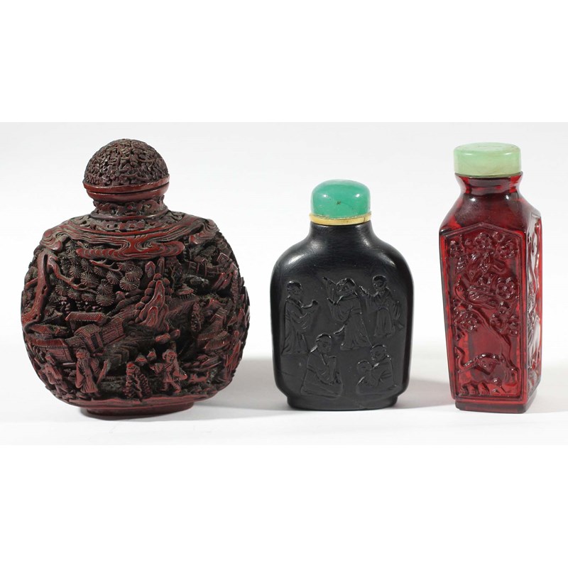 CHINESE AMBER SNUFF BOTTLE, of tapering square section with panels of goats, a dragon and birds in foliage, with nephrite stopper, height 8.5cm; together with a black stone snuff bottle, carved with nine immortals, nephrite stopper, height 7cm; and a cinnabar lacquer bottle and stopper, 20th century (3)