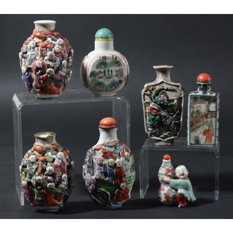 COLLECTION OF SEVEN CHINESE PORCELAIN SNUFF BOTTLES, including two moulded with lohan, another with figures in a boat, other with painted scenes (7)