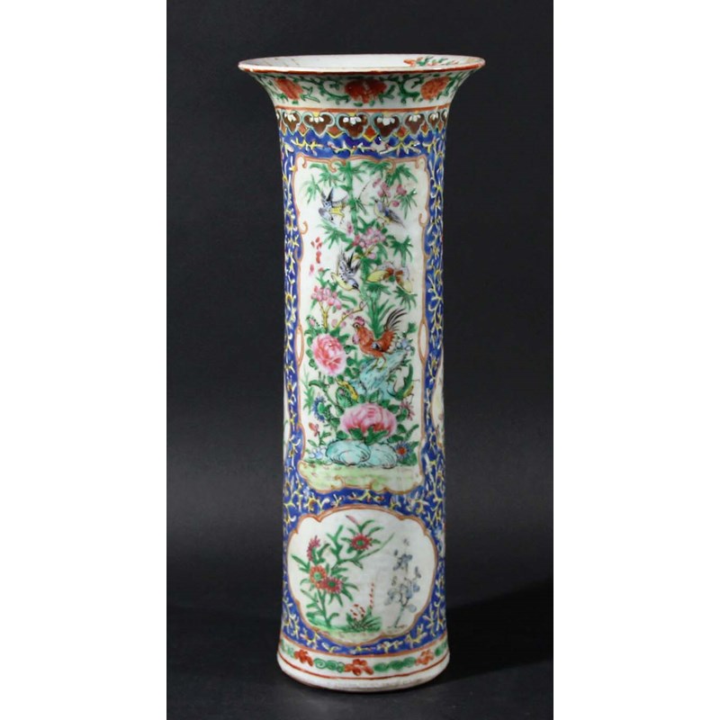 CHINESE FAMILLE ROSE SLEEVE VASE, circa 1900, enamelled with panels of flowers on a blue and floral ground, height 39cm