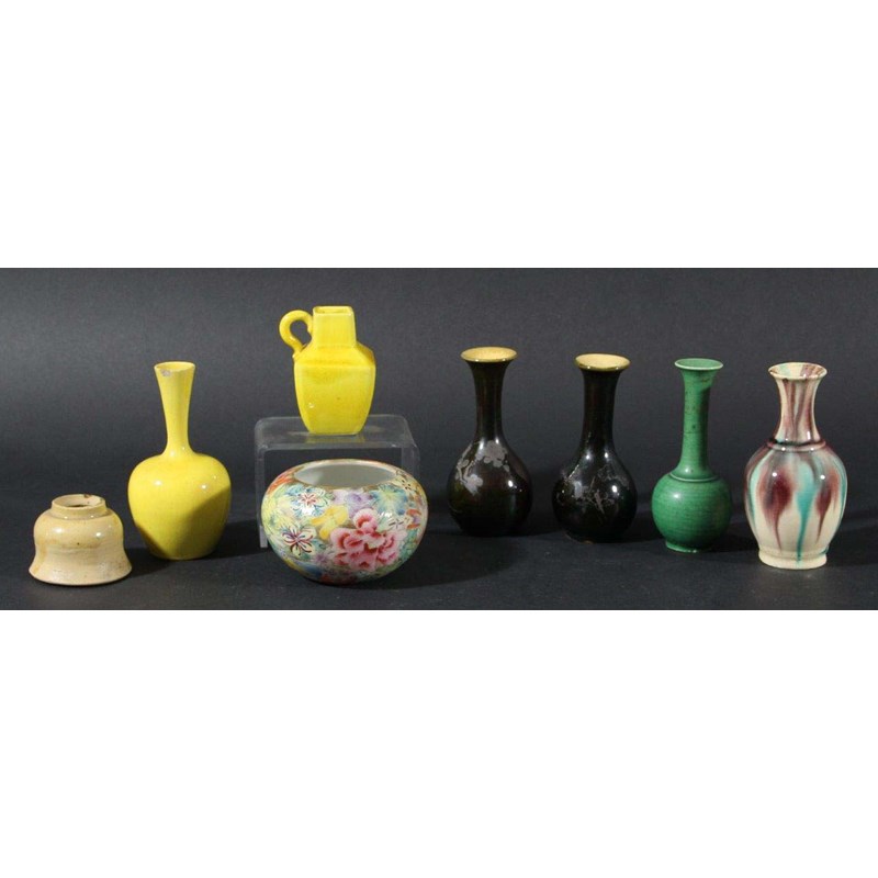 enamelled with numerous flowers, iron red Qianlong style seal mark, diameter 7.5cm; together with a collection of miniature Chinese vases in monochrome and sancai glazes (8)