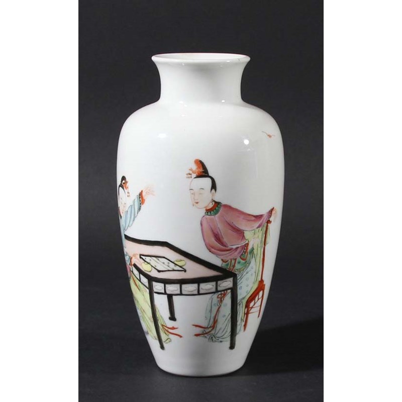 Yongzheng mark but later, of shouldered form, enamelled with two figures playing a board game, blue painted four character seal mark, height 17.5cm
