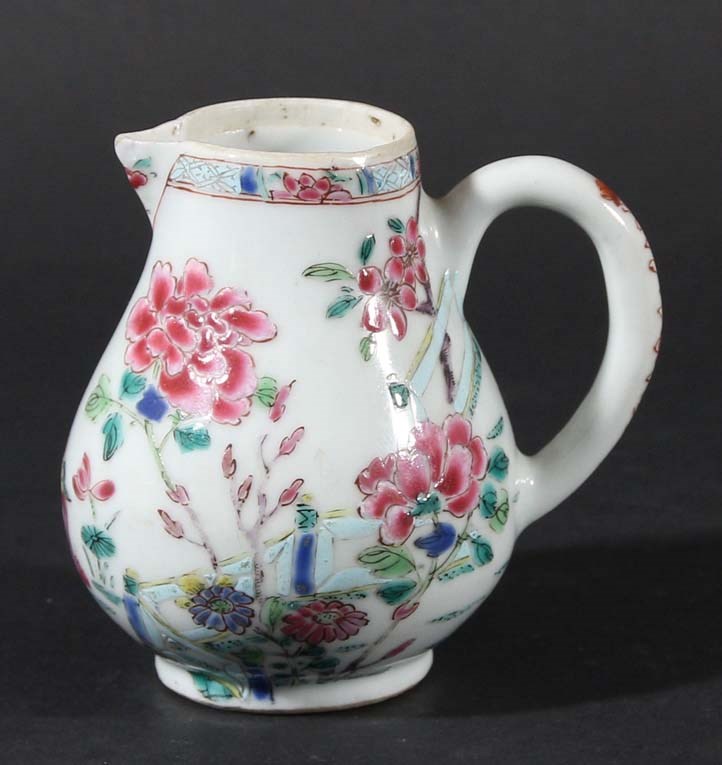CHINESE FAMILLE ROSE SPARROW BEAK JUG, 18th century, enamelled with ducks, flowers and a fenced garden, height 9cm