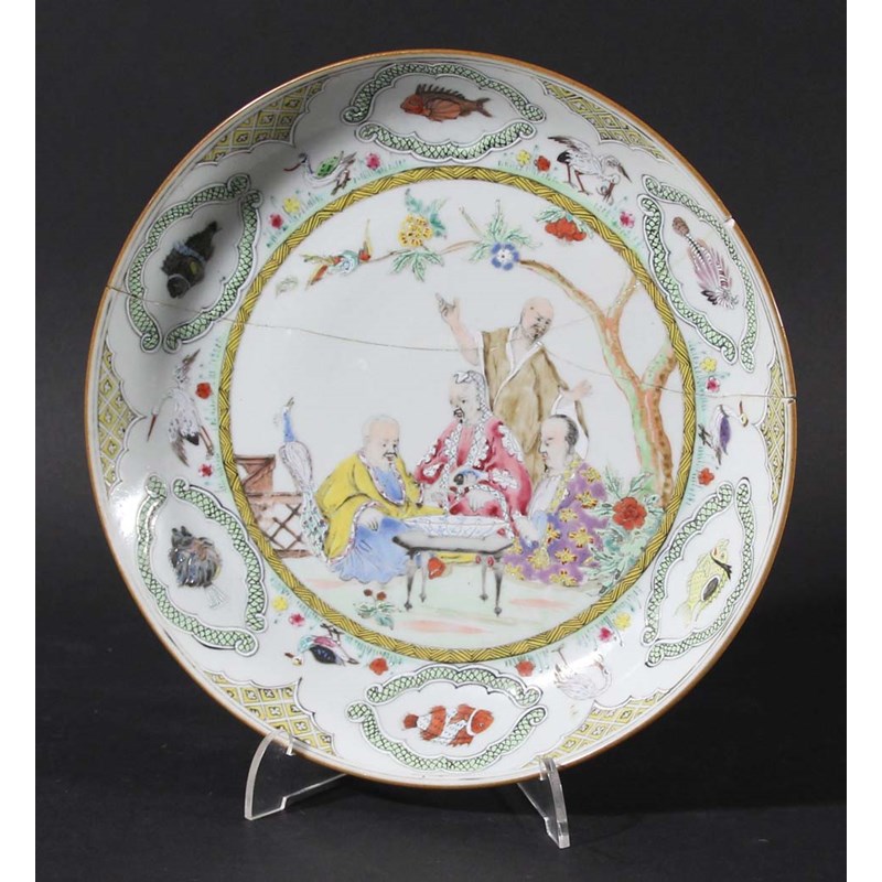 CHINESE FAMILLE ROSE SAUCER DISH, probably Qianlong, enamelled with four men seated around a table with a blue and white dish on it, the border with cartouches of fish interspersed with birds and ducks, diameter 22cm