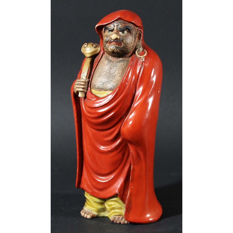 CHINESE FIGURE OF A MONK, late 19th or 20th century, standing wearing a red cloak and holding a gilt ruyi sceptre, height 22cm