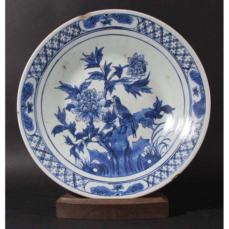 CHINESE BLUE AND WHITE CHARGER, probably 19th century, painted with a bird in flowering branches, diameter 34.5cm