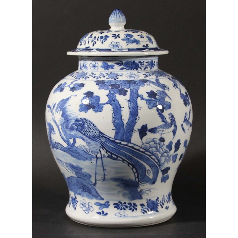 CHINESE BLUE AND WHITE JAR AND COVER, Qianlong style but later, painted with exotic pheasants and other birds among trees in a rocky landscape, blue four character mark, height 25cm (2)